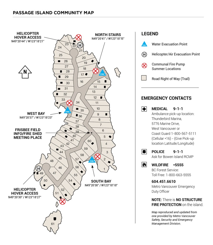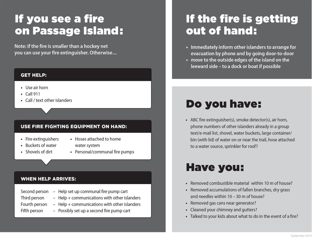 With the help of a municipal grant Passage Island obtained 5 heavy duty commercial fire pumps that are able to pump sea water accessed by fire hoses fed from the ocean. They are located at strategic points across the island (see map on this page).
