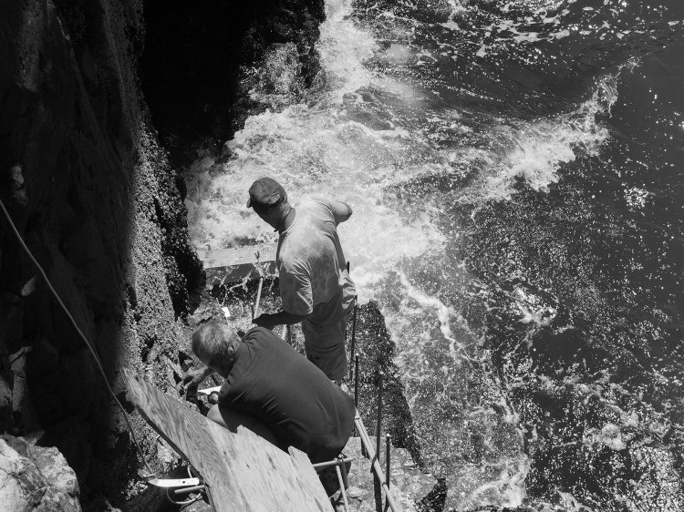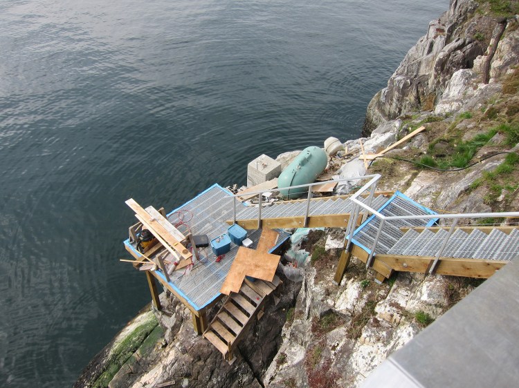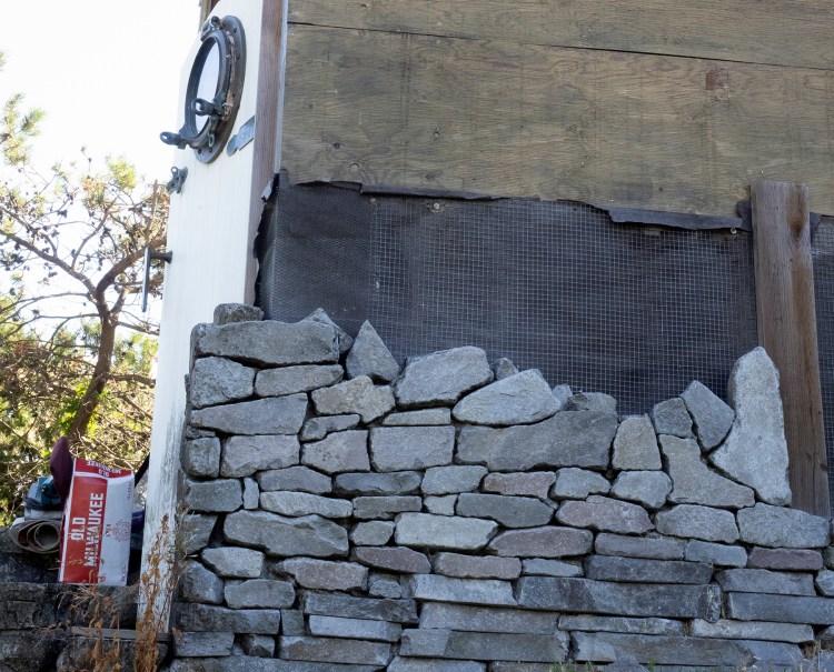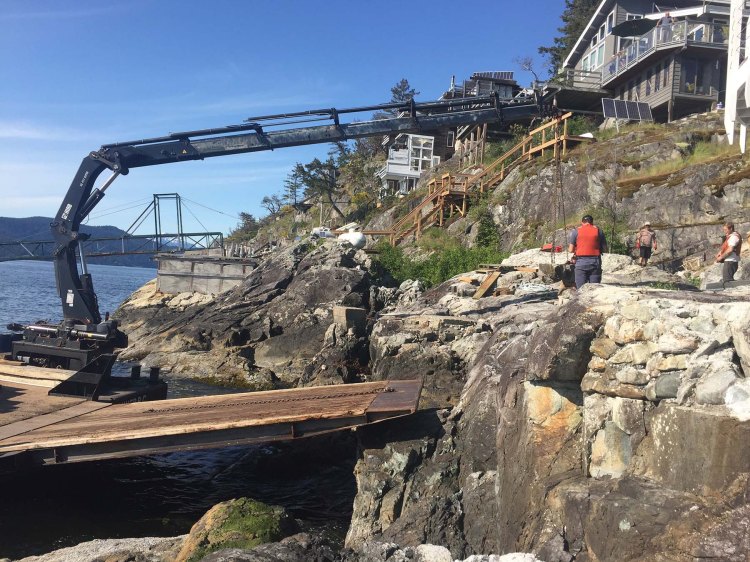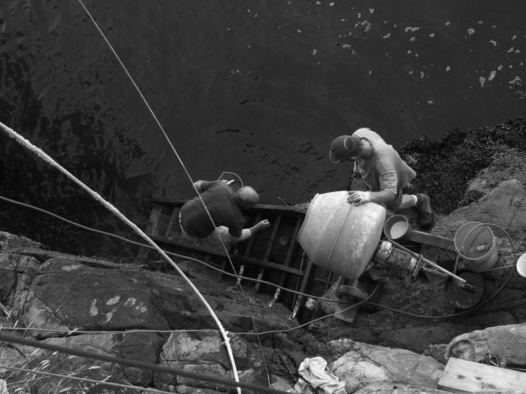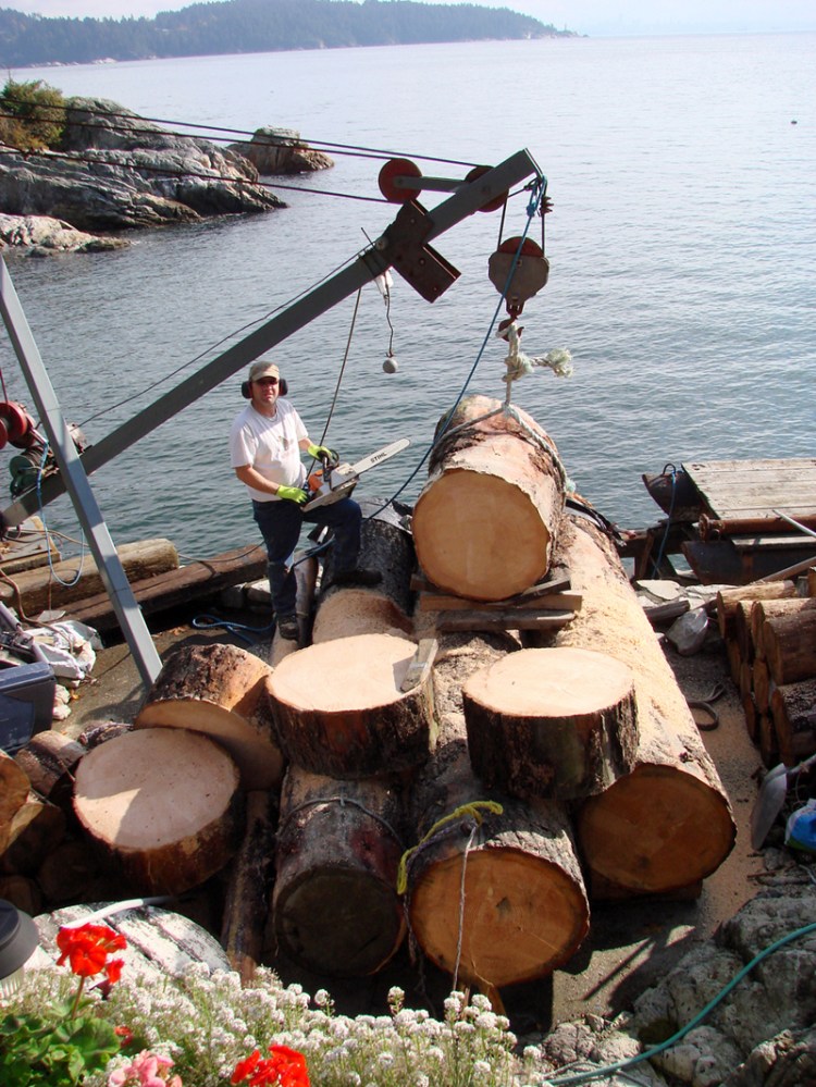 To build a house on the island is a big challenge. There are no roads for trucks to deliver materials or cement trucks to build foundations. Most construction material is delivered by barge and hauled up with cranes, pulleys or human labour. Sometimes helicopters are hired to lift materials from the barge up the cliff to their destination. Once the material is on site the real work begins.