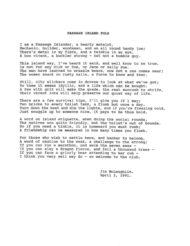 One of them is the annual meeting of PIHA (Passage Island Homeowners Association), an informal organization that plans community projects and events. Minutes of the previous meeting are presented for approval, new initiatives or challenges are discussed, the financial statement is presented and islanders are reminded to pay their modest annual dues. The annual Nautical Mishap Award is given to the person who had the most hilarious or most devastating incident on the water.